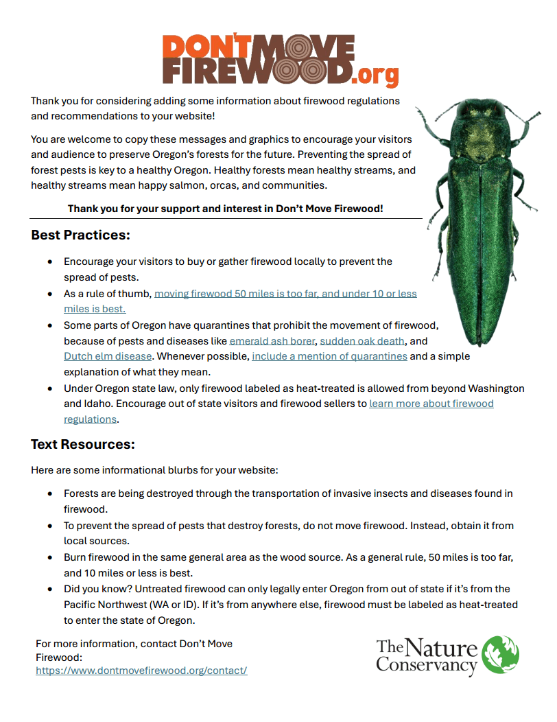 - We also welcome you to link to Don’t Move Firewood (dontmovefirewood.org, or https://www.dontmovefirewood.org/map/oregon/ if you prefer) on your own FAQ page, within campsite information, during the campsite booking process, and in confirmation emails.